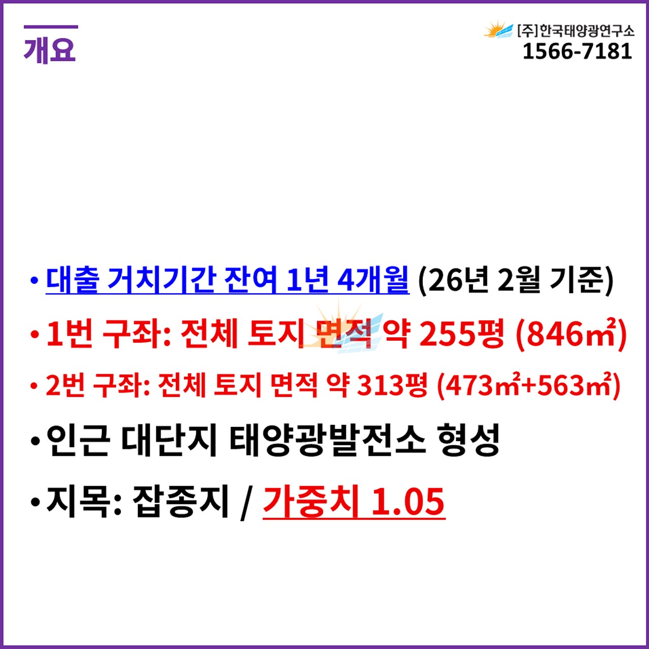 ✅ 1번 구좌: 전체 토지 면적 약 255평 (846㎡)