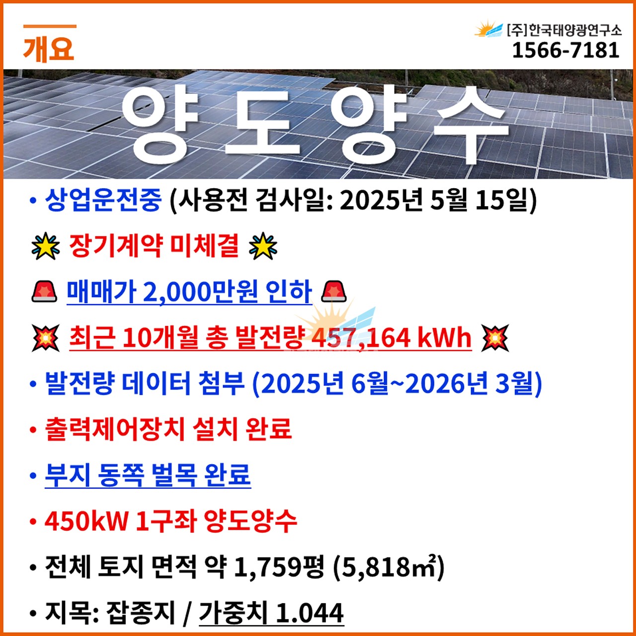 ✅ 매매가: 2억 3,000만원 (한전인입비 포함, 출력제어장치 설치 비용 포함)